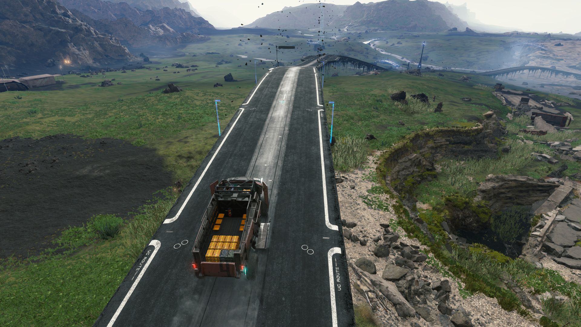 Przyjaźń z kijem jest tu wystawiona na próbę, jako że nie on gra pierwsze skrzypce. O ile na twierdzenia Kojimy o zapoczątkowaniu nowego gatunku zwanego "strand game"[4] można patrzeć z przymrużeniem oka, tak nie da się ukryć, że pod względem rozgrywki jest to bardzo unikalna i w znaczącej większości pozbawiona przemocy pozycja. Nawet z niewielkimi osadami przeciwników można sobie radzić bez przykładania palca do spustu. Sam jest kurierem i właśnie na tym oparte są niemal wszystkie aktywności. Na roznoszeniu paczek. W większości innych tytułów proces podróżowania jest jedynie wypełniaczem - niewdzięcznym zajęciem oddzielającym od właściwej zabawy, które często chce się pominąć za pomocą szybkiej podróży czy króliczych skoków. Tutaj przyjmuje on formę zaskakująco złożonej mechaniki będącej w stanie udźwignąć ciężar pozycji z otwartym światem.
