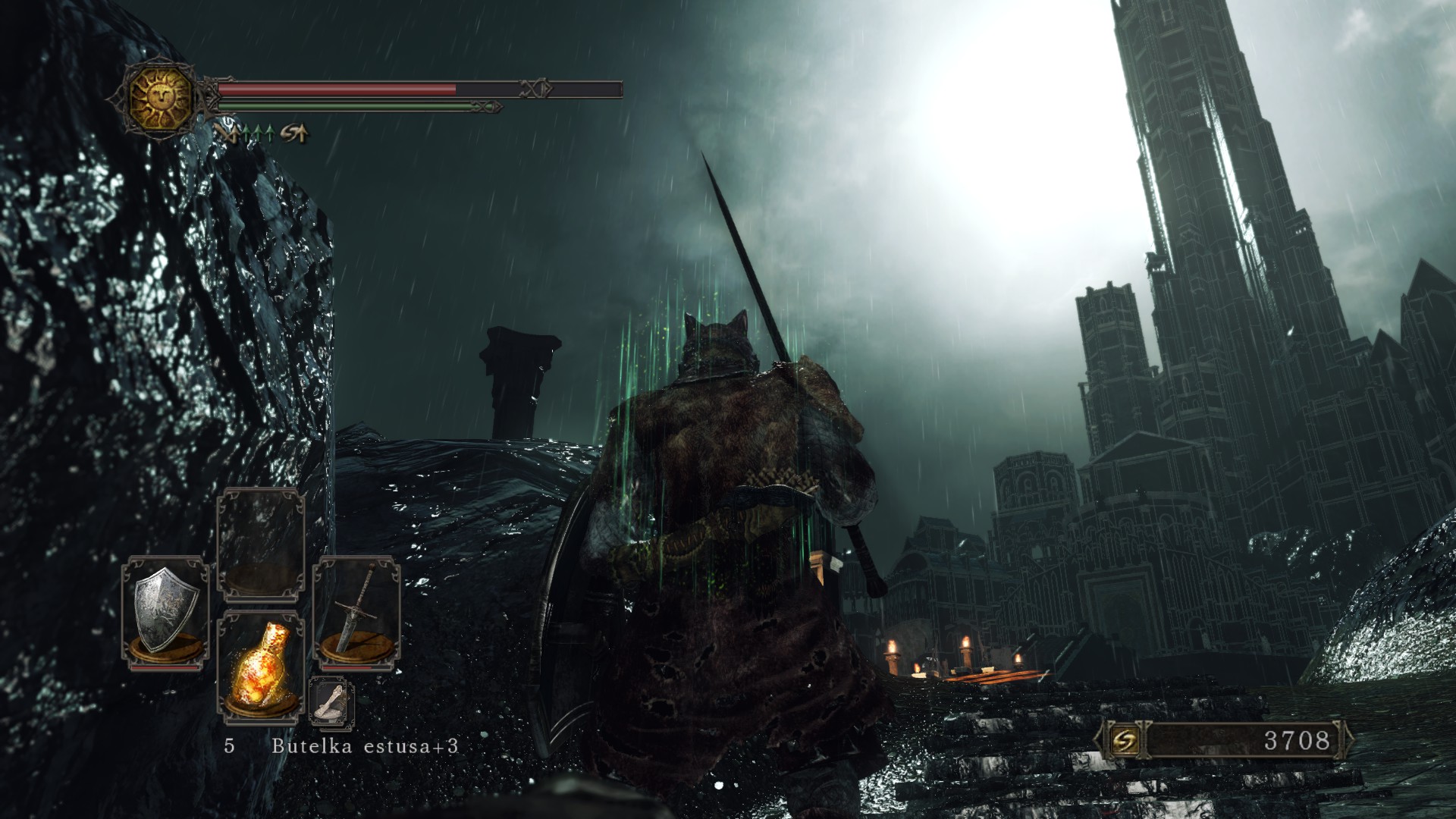 Zmiany najbardziej widoczne są w systemie walki. Pierwsze Dark Souls polegało przede wszystkim na pojedynkach, gdzie starcia z wieloma przeciwnikami często stawały się frustrujące, w dużej mierze przez nie najlepszą i niesprawiedliwą detekcję kolizji czy niezbyt obszerne lokacje. Druga część zmienia to całkowicie, niejednokrotnie rzucając w moim kierunku chmarę wrogów jednocześnie i zmuszając tym samym do zmiany przyzwyczajeń. Blokowanie kamery na maszkarze nie jest już domyślnym działaniem, a przemyślaną decyzją podejmowaną w odpowiednich chwilach. Uwolnienie wizji oraz podejmowanie większego ryzyka, by zadać obrażenia, staje się koniecznością, co równoważą zmiany w systemie leczenia. Oprócz klasycznych butelek Estusa, w ekwipunku nosiłem również klejnoty życia, działające na podobnej zasadzie co trawy w Demon’s Souls. Ich użycie zajmuje mniej czasu niż wypicie złotej butelki, dzięki czemu nadają się do korygowania niewielkich błędów, ale przy tym zdrowie regeneruje się znacznie wolniej, co również należy mieć na uwadze.