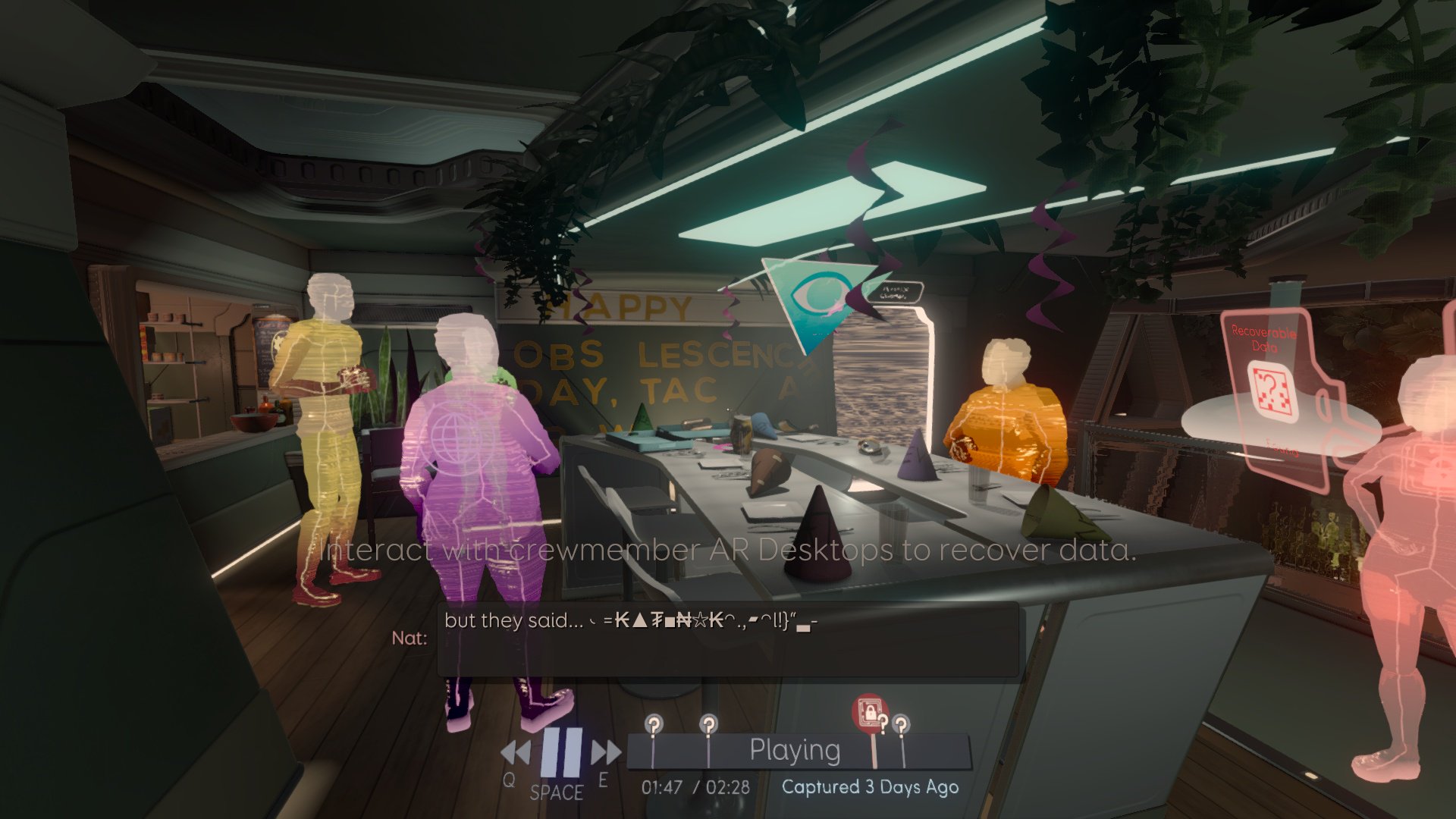 Strona wizualna oraz setting podobały mi się znacznie bardziej niż w Gone Home i znacznie ciekawiej było przeglądać pomieszczenia czy przedmioty. Ciekawy jest też główny pomysł na narrację - wszystkie rozmowy obserwuje się w formie skanów postaci AR. Wirtualne szkielety bohaterów replikuja ich ruch. Takie rozszerzenie pomysłu na audiologi. Fajnie to działa, zwłaszcza że żeby wszystko ogarnąć trzeba też cofać nagrania i śledzić różne postacie, które w tym samym czasie są w różnych pomieszczeniach i robią inne rzeczy.